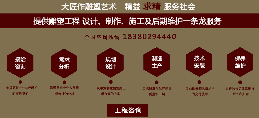 成都大匠作雕塑有限公司,是經(jīng)成都工商局審定注冊(cè)的正規(guī)專業(yè)雕塑制作及工程安裝服務(wù)機(jī)構(gòu),是由一群年輕富有朝氣的年輕人創(chuàng)辦,發(fā)軔于四川省成都市龍泉驛區(qū)。它是一家******于創(chuàng)作、制作和銷售為一體的公司。大匠作擁有多年從事公共藝術(shù)的專業(yè)人員和雕塑制作人組成的核心團(tuán)隊(duì),為您提供專業(yè)、具創(chuàng)新的設(shè)計(jì)及制作服務(wù)。公司成立以來,秉承“******服務(wù)、誠(chéng)信為本”的宗旨,以客戶需求為目標(biāo)導(dǎo)向,不斷學(xué)習(xí),進(jìn)取,優(yōu)化和提高服務(wù)質(zhì)量,公司向您******——“您的滿意***是我們的信譽(yù)”,我們將以飽滿的熱情和******的服務(wù)贏得您的贊譽(yù)和支持。 愛心,細(xì)心,耐心,責(zé)任心是我們的要求,盡心盡職,為您打造出創(chuàng)新、專業(yè)、******的設(shè)計(jì)方案,我們堅(jiān)信先做人、后做事,用心對(duì)待客戶,實(shí)行透明收費(fèi),人性化服務(wù),本著對(duì)客戶負(fù)責(zé),對(duì)客戶負(fù)責(zé),更是對(duì)自己發(fā)展負(fù)責(zé)的態(tài)度,爭(zhēng)取做到讓每位客戶滿意